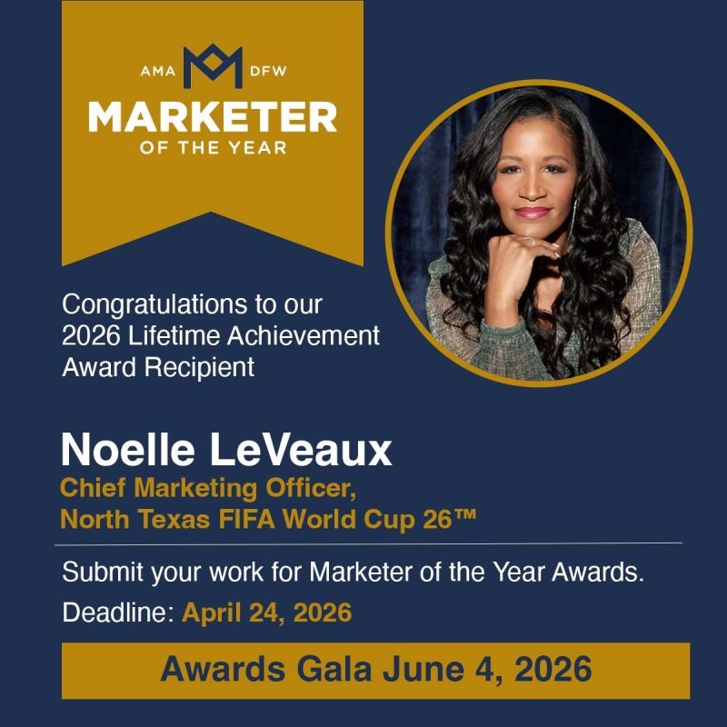 The American Marketing Association Dallas-Fort Worth Chapter is proud to announce Noelle LeVeaux, Chief Marketing Officer, North Texas FIFA World Cup 26™, as the recipient of the 2026 AMA DFW Lifetime Achievement Award—our highest honor.