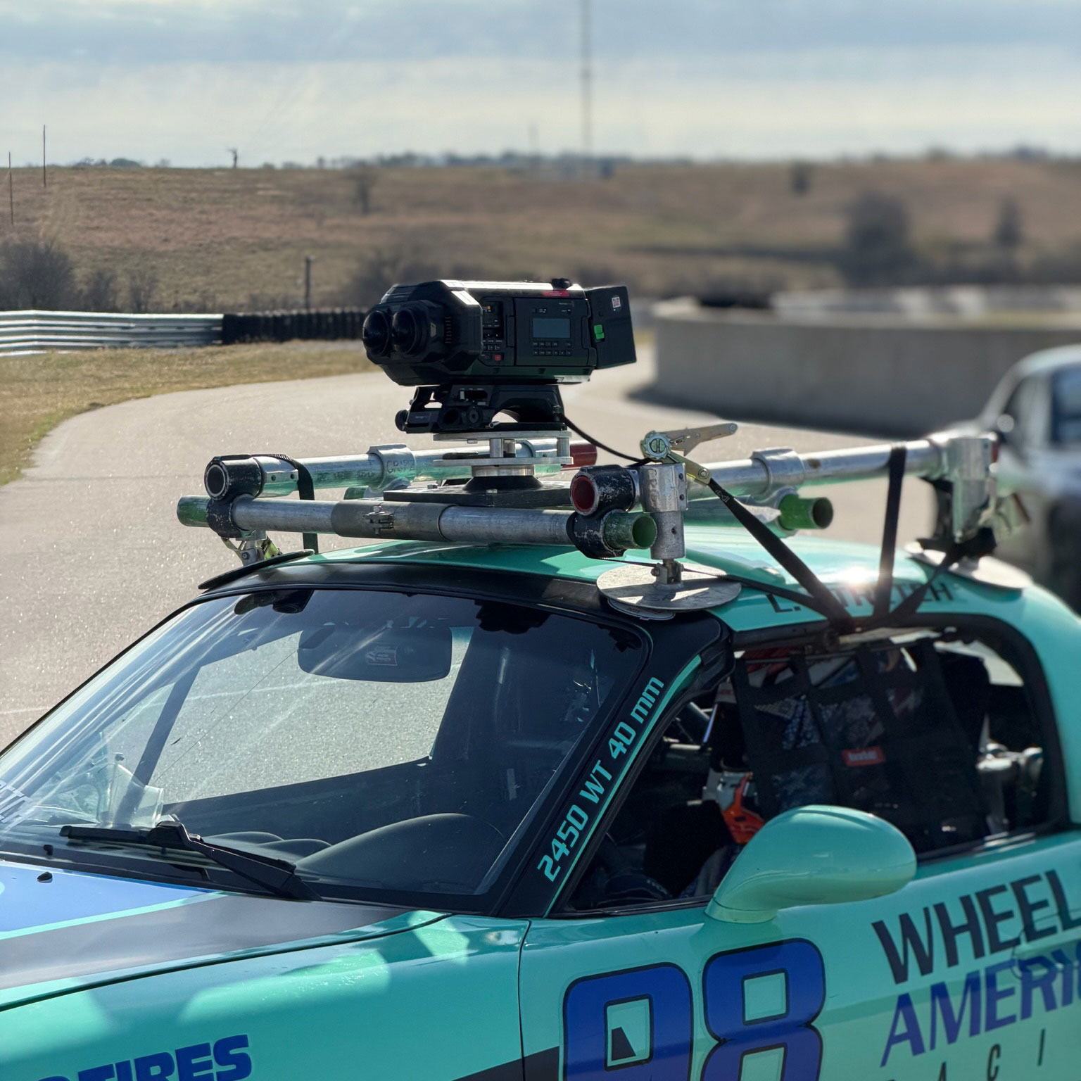 During practice and qualifying sessions, the camera was mounted directly to Max’s Spec Miata, capturing a true driver’s-eye perspective of the track. The system’s resolution and motion clarity helped maintain a sense of depth and realism, particularly when viewed on Apple Vision Pro, where small details like track texture, steering inputs, and relative speed become immediately perceptible.